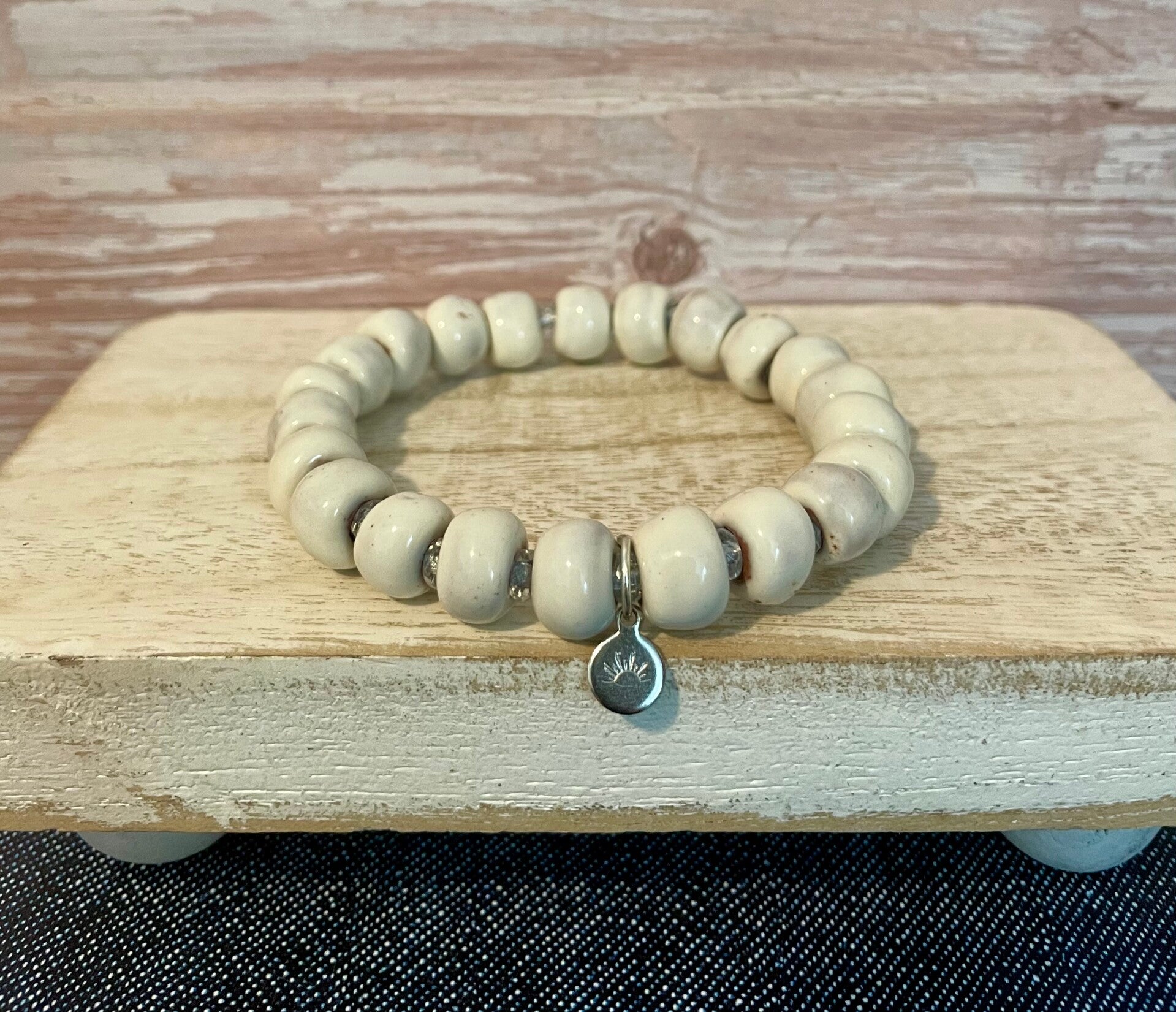 Handmade ceramic beads paired with sliver-lined Czech glass spacers. Strung on quality elastic cord, stretches to a 7.5" wrist.