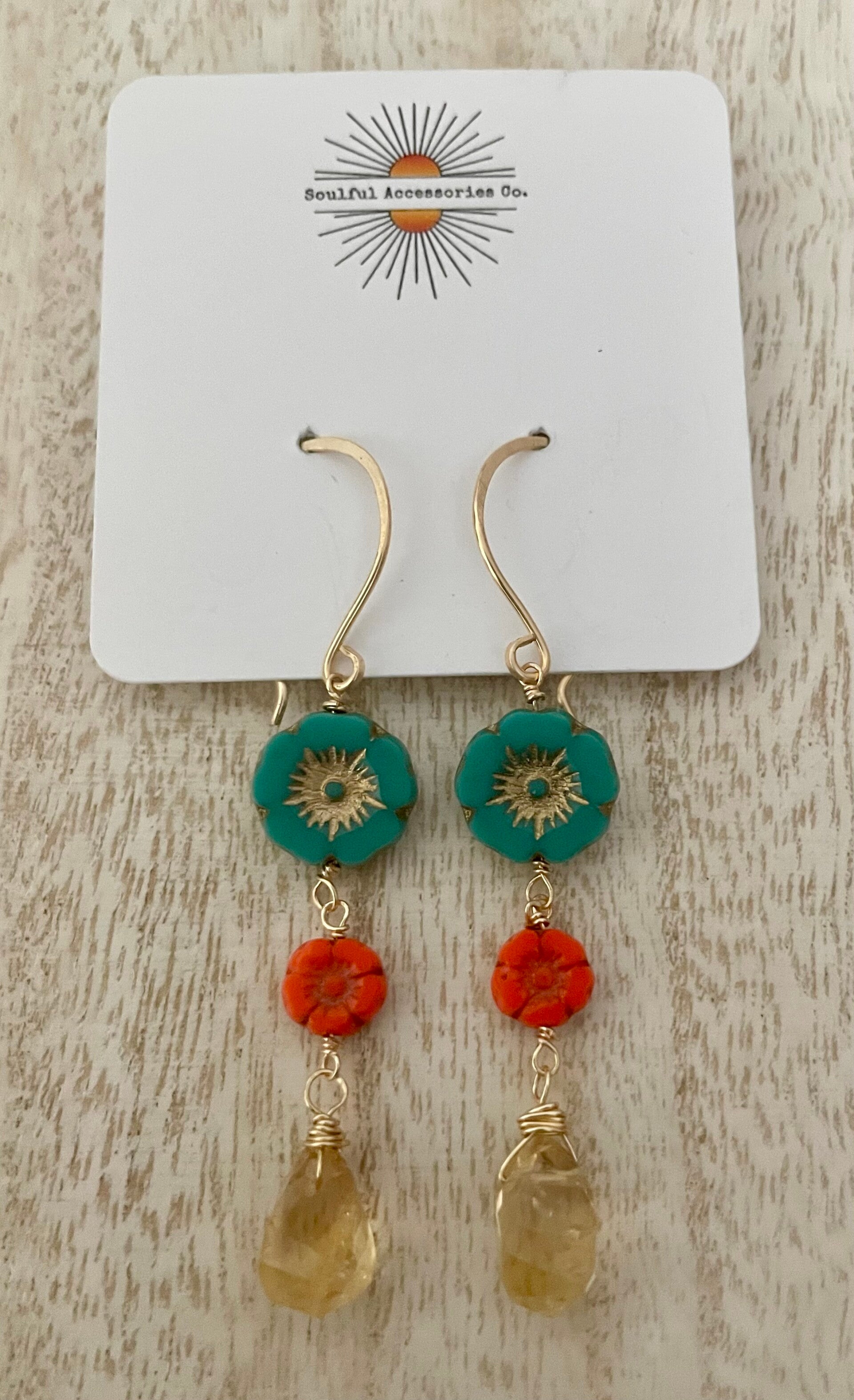 Lovely Czech flowers finished with faceted citrine drops. The earrings hang 2.5" long. Wrapped with gol-plated wire, handmade 14k gold-fill ear wires.